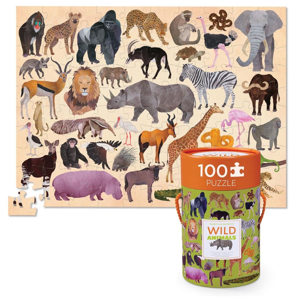 Este rompecabezas de 100 piezas es desafiante y divertido para que los niños aprendan las diferentes especies de animales que habitan en nuestro mundo.