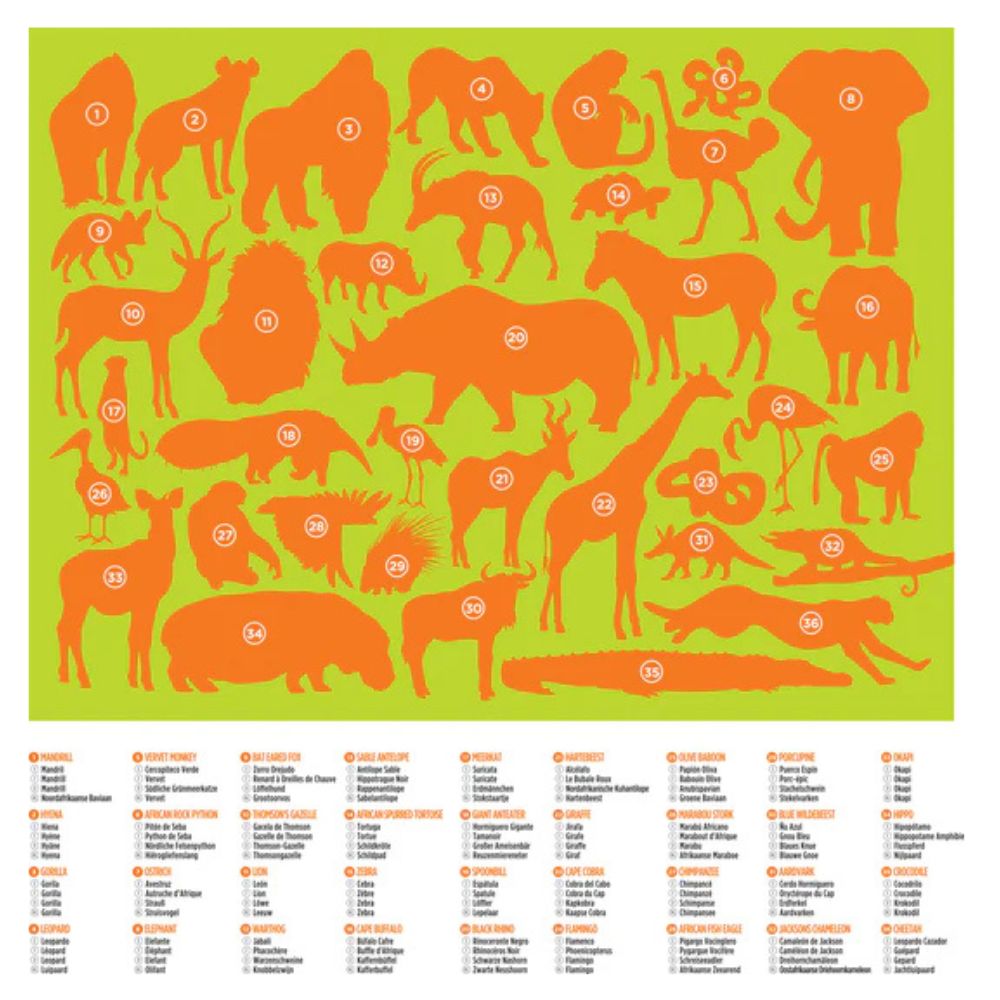 - Cada rompecabezas crea un entorno de aprendizaje que incluye 36 animales diferentes y un cuadro que enumera el nombre de cada animal en varios idiomas.