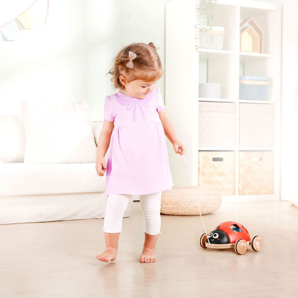 Mariquita clasificadora de formas que viene con cuatro bloques de diferentes formas geométicas. Las alas tienen agujeros de diferentes formas o se pliegan para que puedas colocar bloques en el interior y las ruedas tienen borde de goma para no rayar el piso!