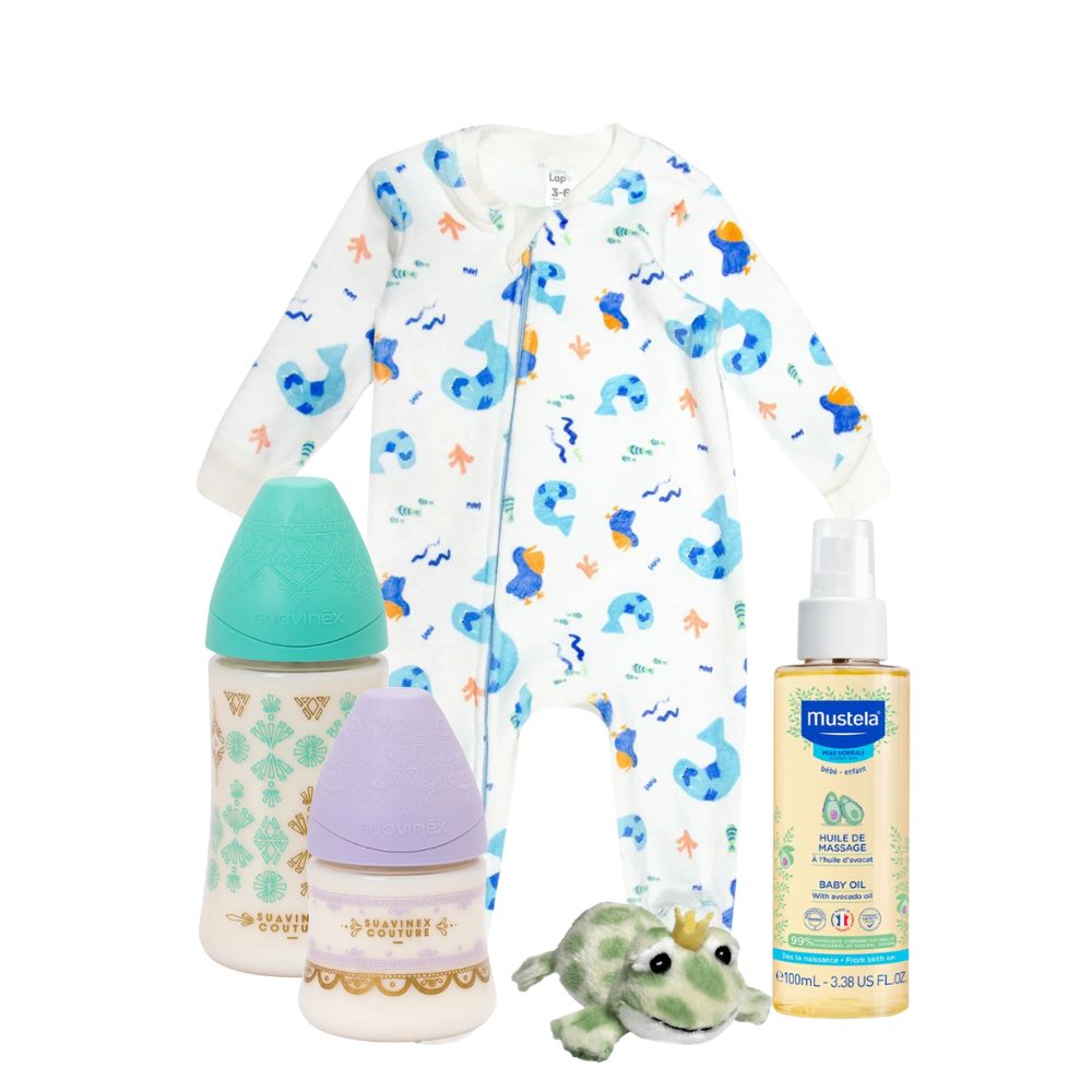 El sonajero Cloudb con sus suaves sonidos de lluvia lo arrullará hacia el sueño, mientras que los dos teteros Suavinex están listos para la última toma de la noche o la primera de la mañana. ¡Todo lo que necesitas para una rutina de dormir perfecta!