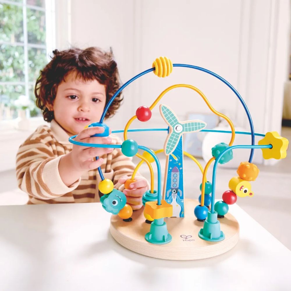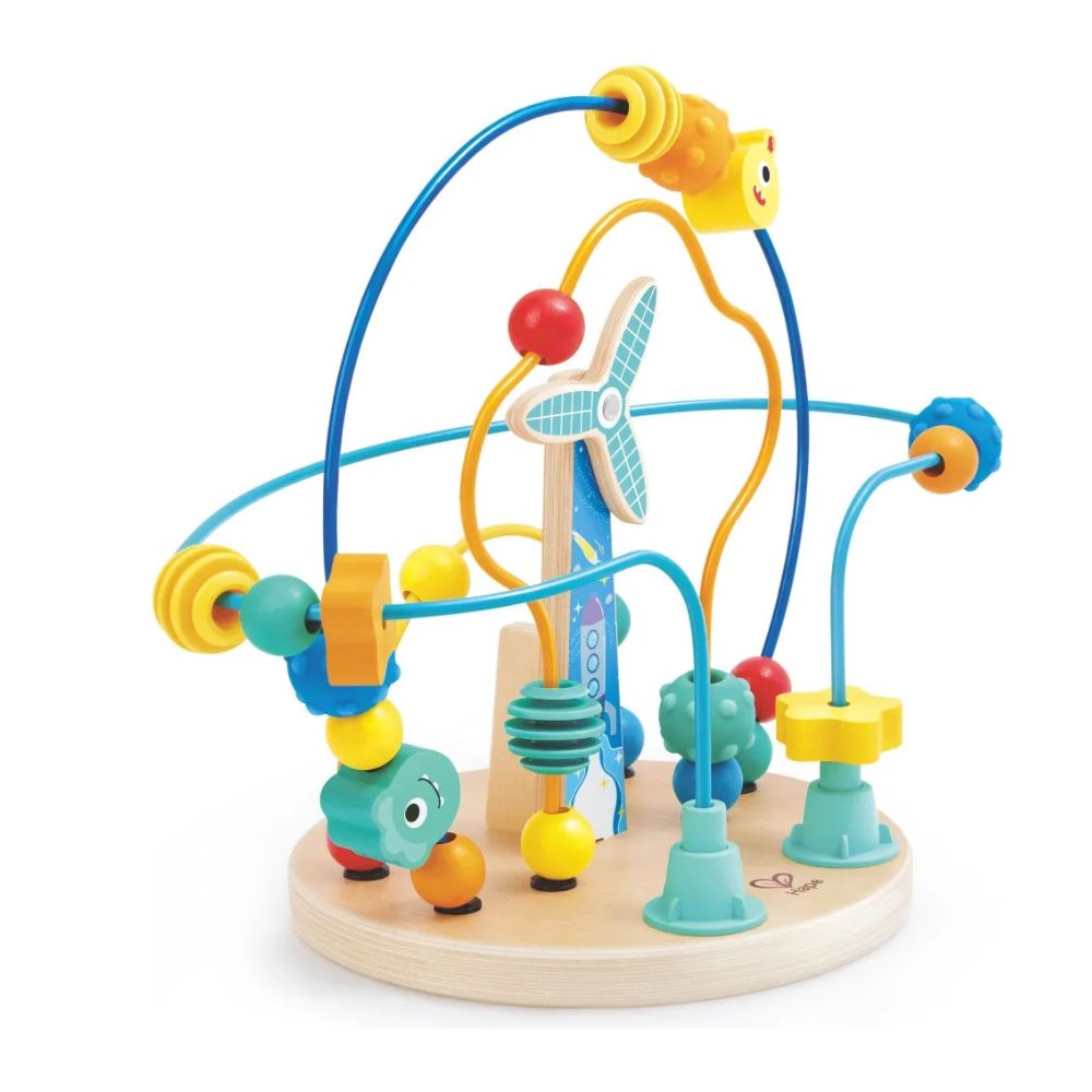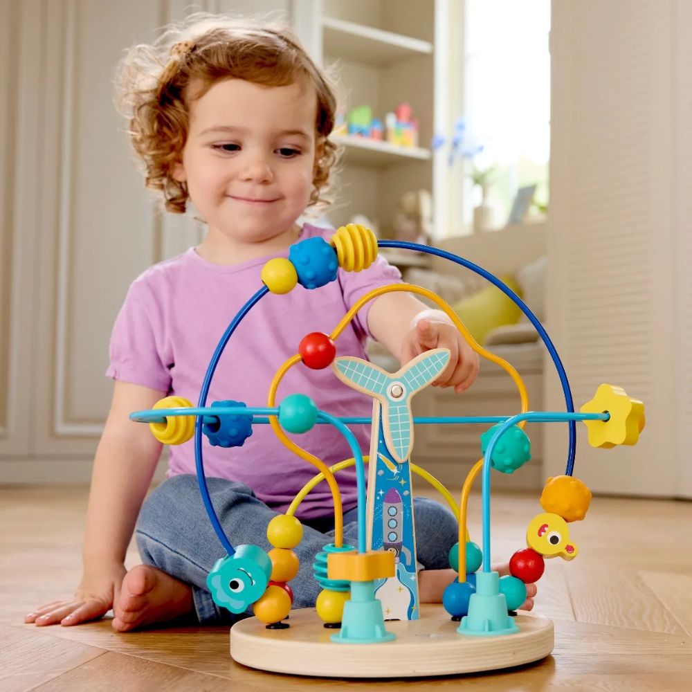 Su molino giratorio central facilita el desplazamiento de las cuentas mientras añade un elemento dinámico adicional. Ideal para fortalecer la coordinación ojo-mano, reconocimiento de colores y motricidad fina, este laberinto transforma el juego libre en una herramienta de aprendizaje integral que cautiva a los pequeños exploradores.